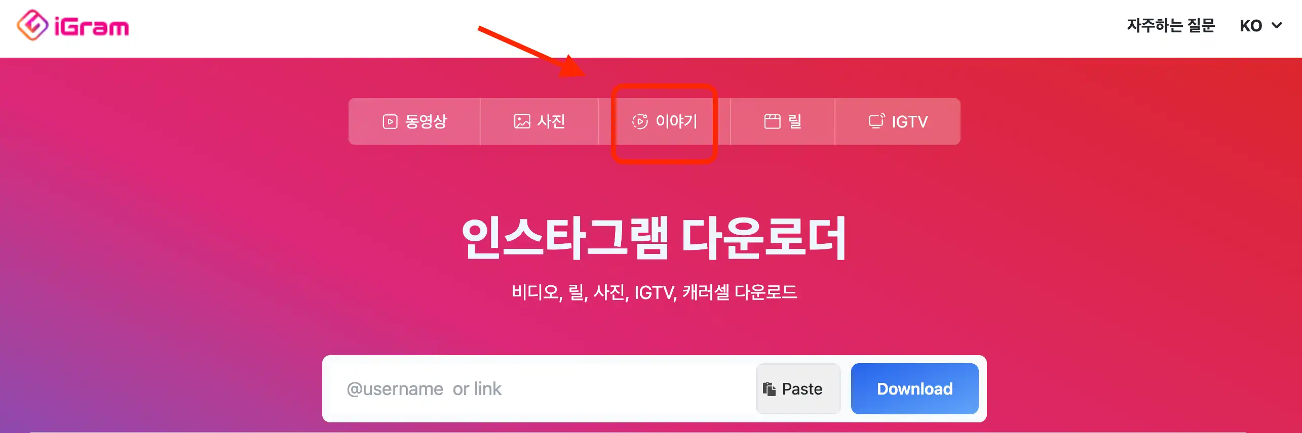 동영상, 사진, 스토리, 릴스 다운가능합니다. 한글 지원 가능한데, 스토리를 이야기로 번역했네요. 참고하시기 바랍니다.